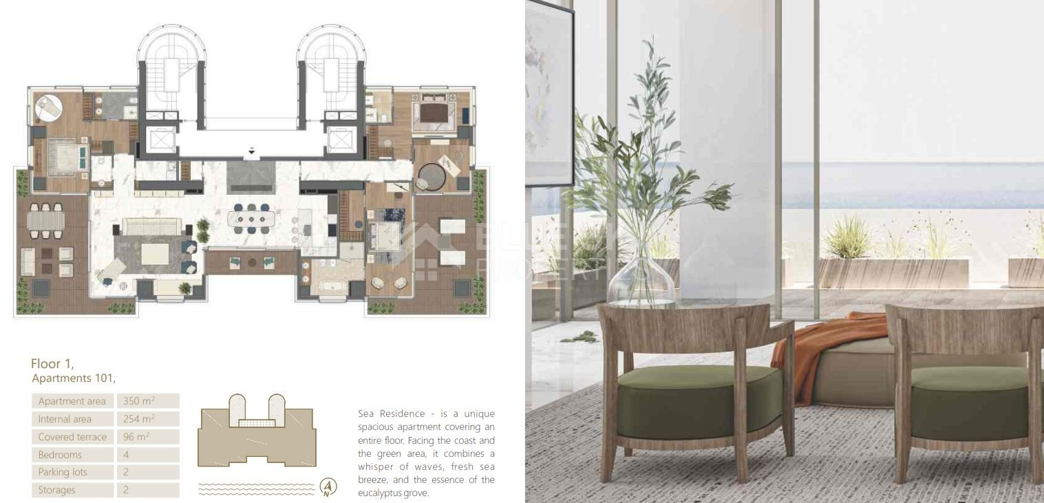 Two full-floor four-bedroom apartments are available on the 1st and 10th floors, each offering 254 sq.m. of internal space and 96 sq.m. of covered verandas, with identical layouts and maximum privacy.