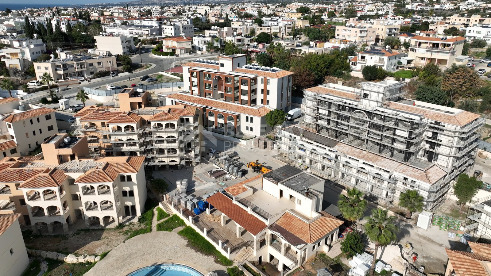 A: The apartment is in a modern gated residential development in Chloraka, just 5 minutes from Paphos town and a short drive to the beach. The Paphos International Airport is approximately 15–20 minutes away.