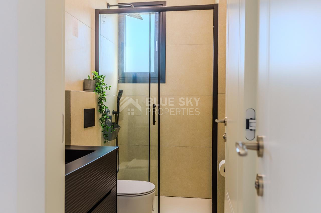 Answer: Both bathrooms have modern fixtures and finishes, while the bedrooms are generously sized with built-in storage, ensuring comfort and convenience.