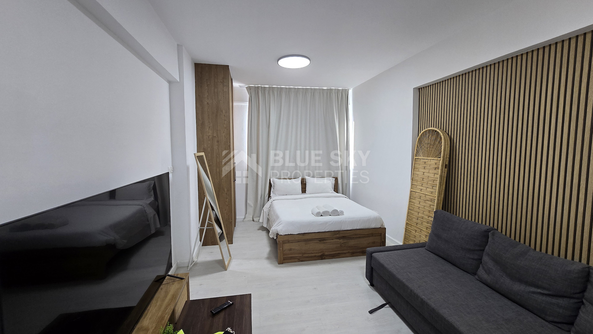 The apartment includes one stylish bathroom, designed with quality fixtures for your comfort. Enjoy year-round comfort with a central air conditioning system, ensuring the perfect indoor climate at all times. Large windows let in plenty of natural light, creating an inviting atmosphere.