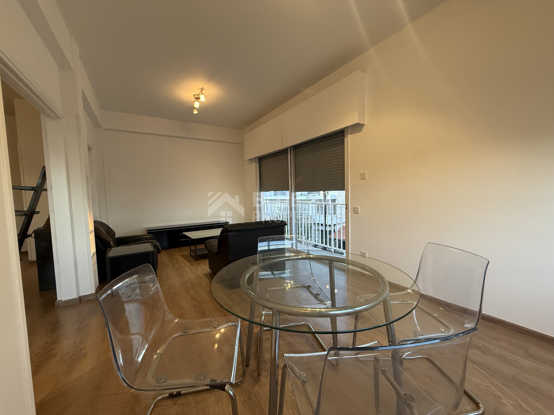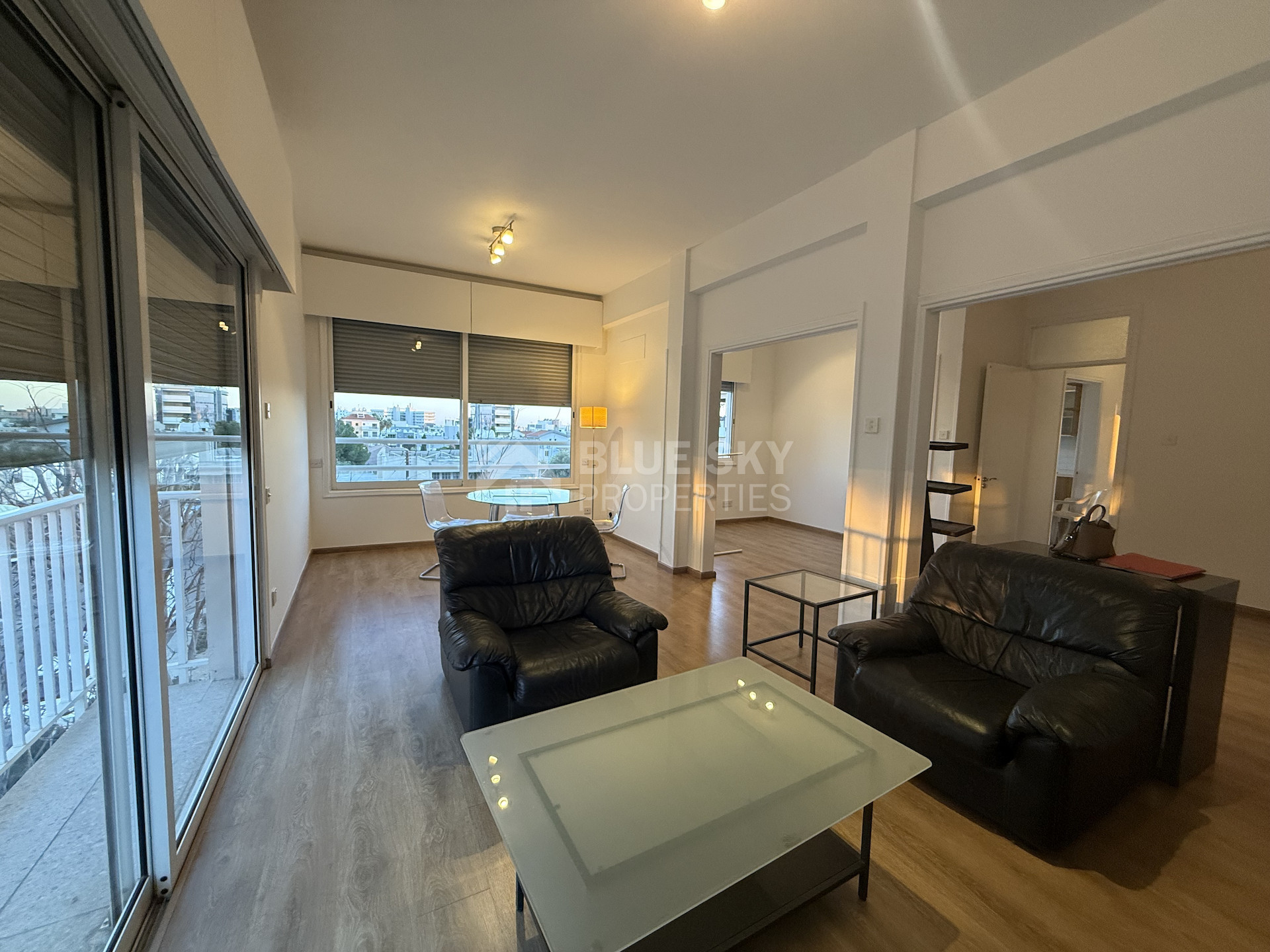 The apartment is in excellent condition, featuring laminate parquet flooring throughout and large windows that bathe the space in natural light, creating a bright and airy atmosphere. Electric shutters provide convenience and added security.