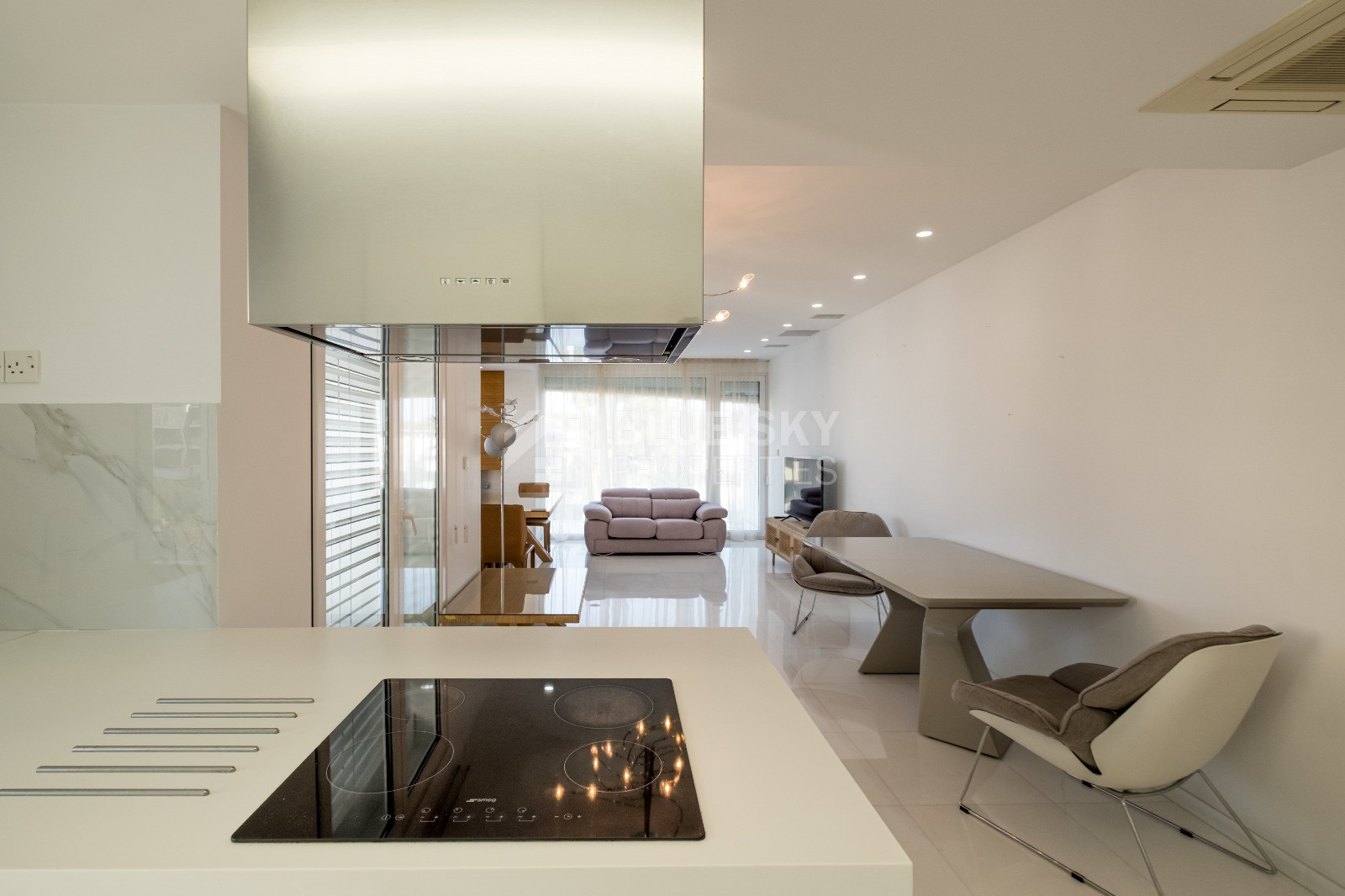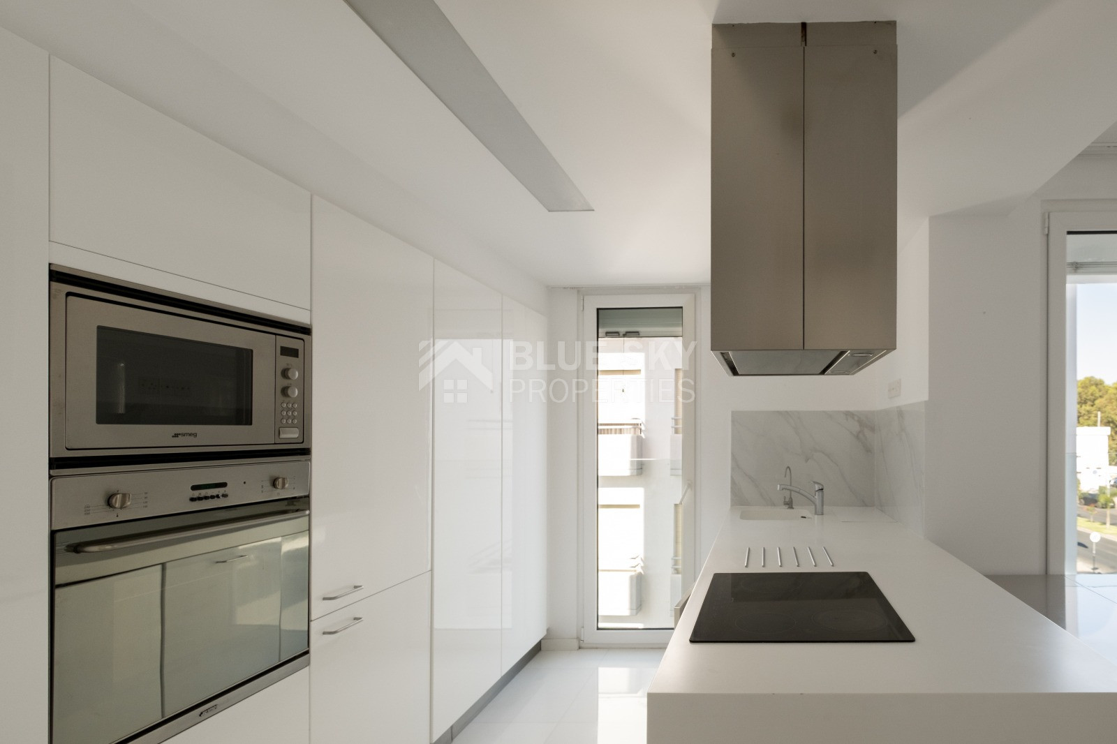 Located on the second floor of a gated building, the apartment features a well-designed interior with spacious living areas finished with Thasos marble flooring and laminated wooden floors in the bedrooms. The island kitchen is fully equipped with built-in appliances, while the apartment offers two bedrooms, including a master bedroom with en-suite, as well as a main bathroom with jacuzzi. A large covered veranda extends the living space outdoors, perfect for relaxing and enjoying the vibrant seafront atmosphere.