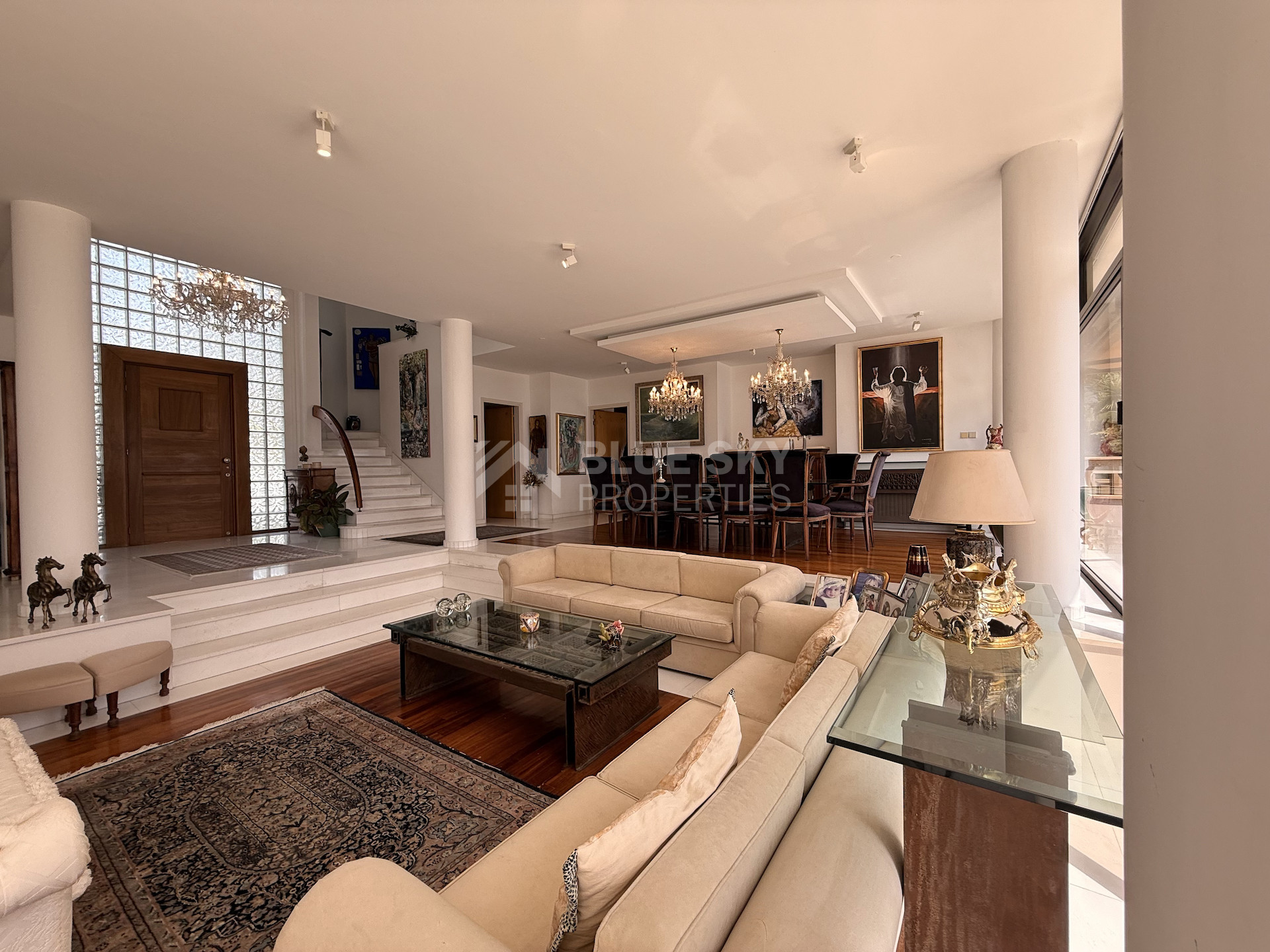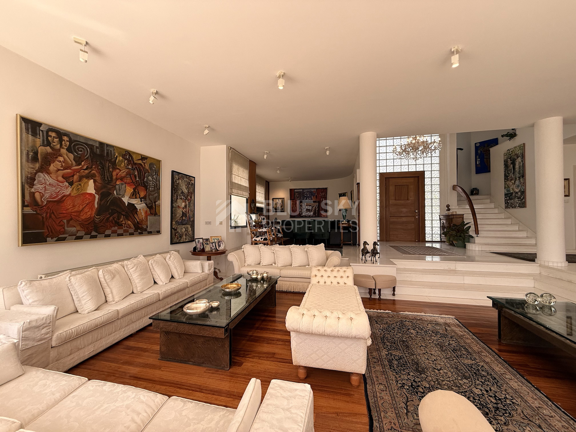 Accessed via an electric drive-in entrance, the home immediately impresses with its grand presence and beautifully landscaped gardens. Designed for both comfort and entertaining, the outdoor areas feature generous terraces and a large swimming pool, complemented by a dedicated BBQ space—perfect for hosting and enjoying the Mediterranean lifestyle.