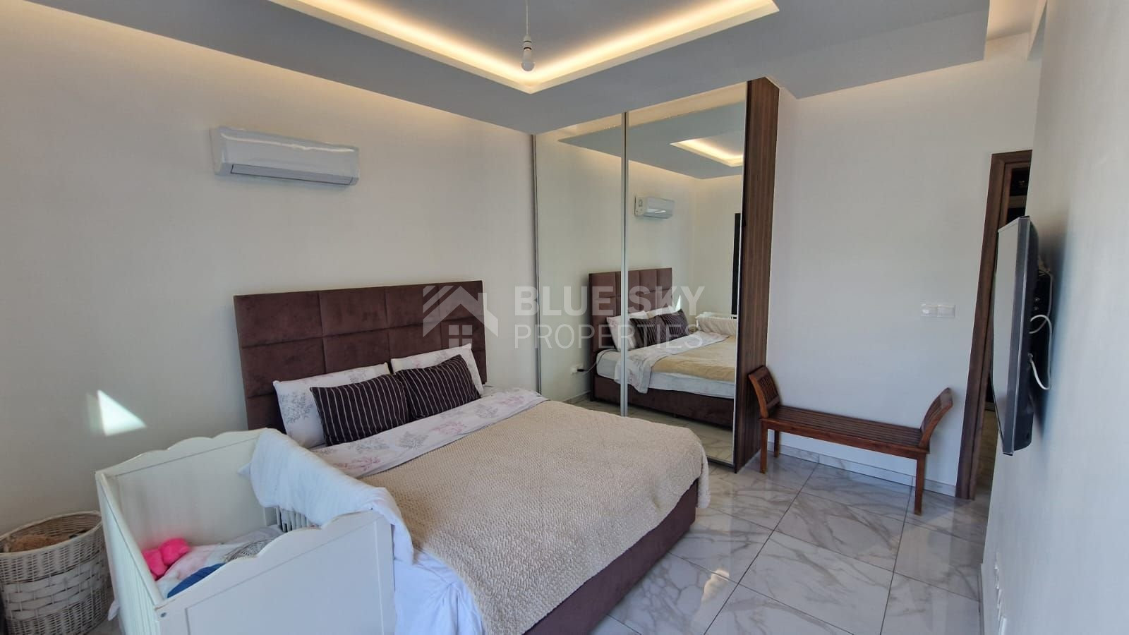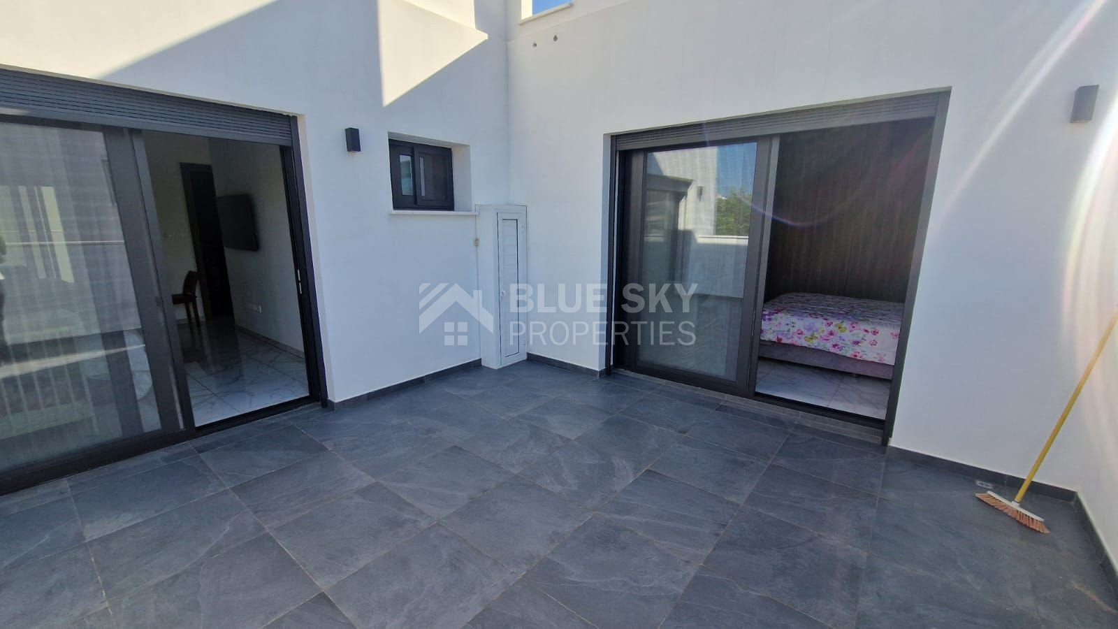 On the second floor, you’ll find another kitchenette in the corridor, a family bathroom with a bathtub, and three bedrooms. The master bedroom includes an ensuite shower and shares a large balcony with the guestroom, while a smaller balcony faces the front.