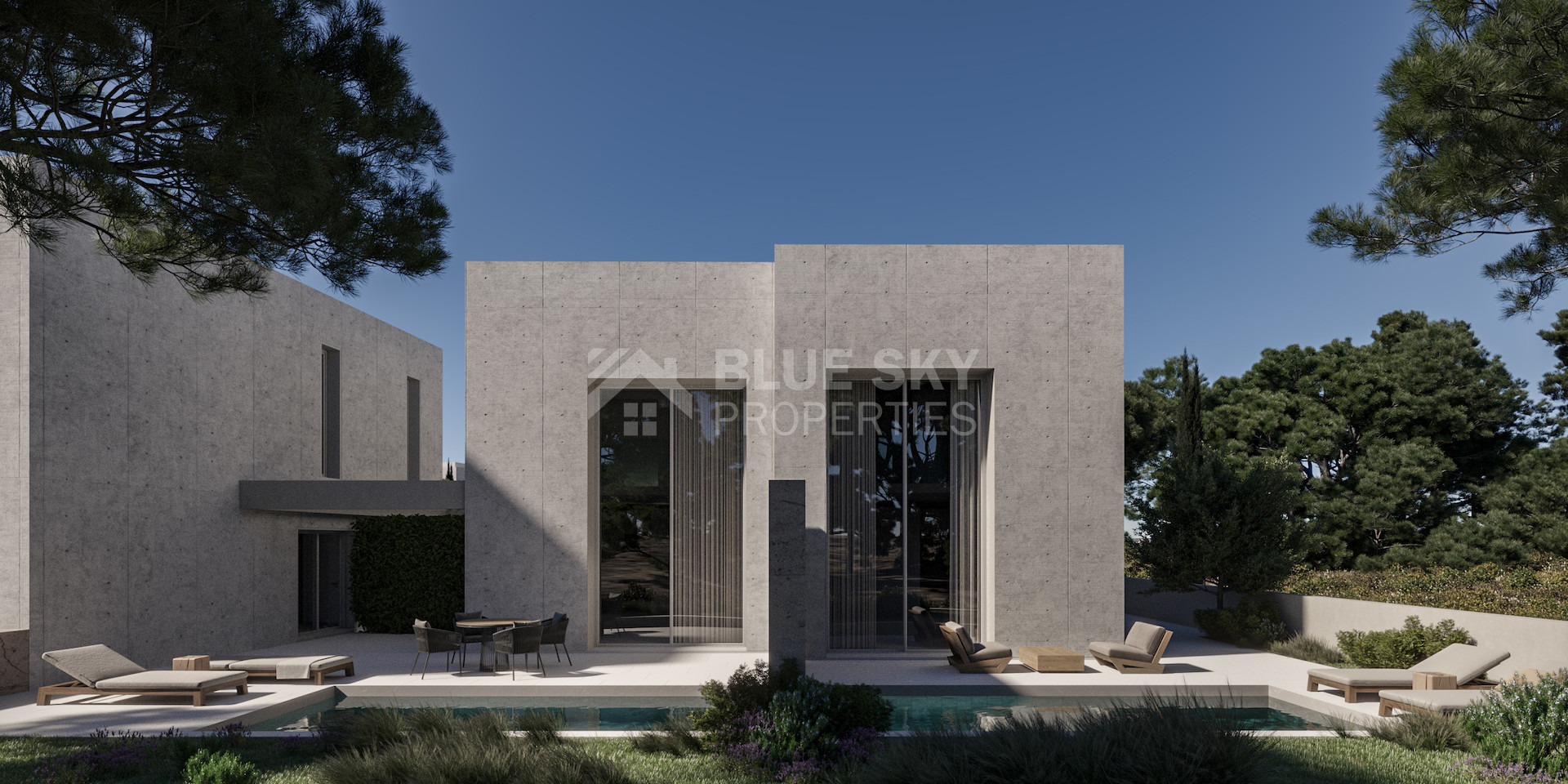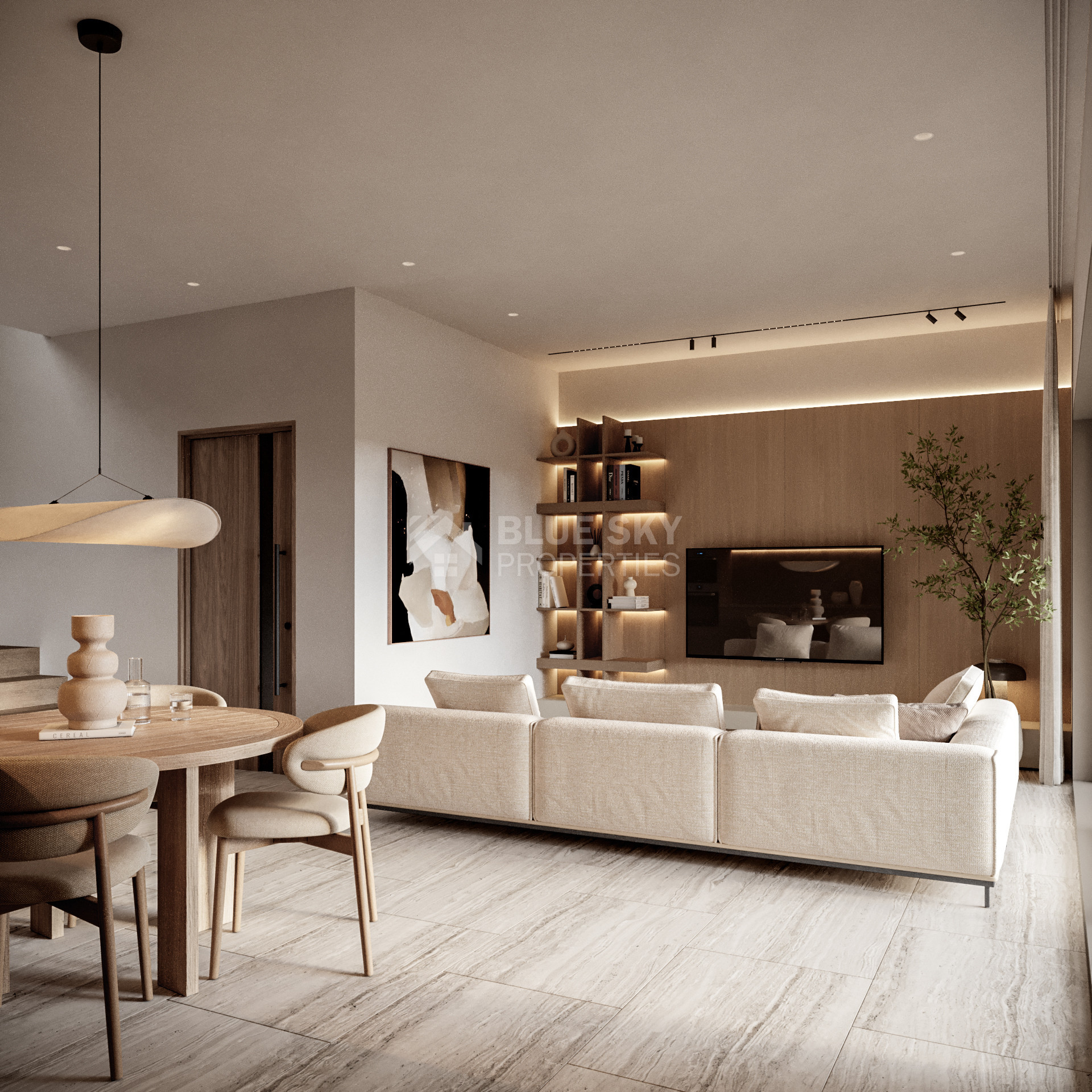Design Style: Modern architecture with floor-to-ceiling windows, travertine finishes, large tiles, built-in sanitary ware, and concealed air-conditioning for a sleek, light-filled interior.